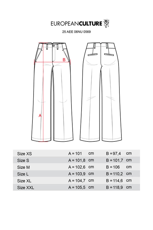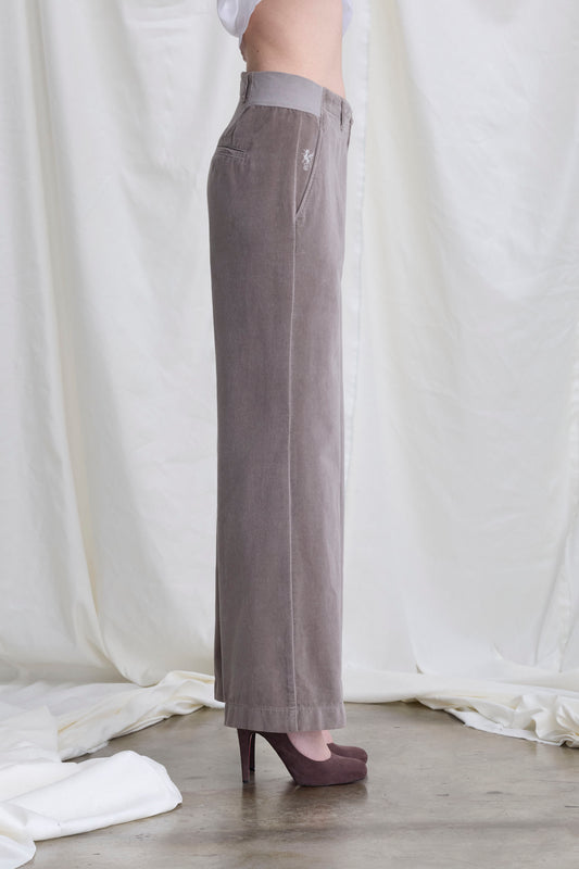 Wide-leg trousers made of cotton velvet. Side comfort inserts at the waist and a classic triangular detail at the center back. Slant pockets. Front closure with exposed button and hidden zip.
