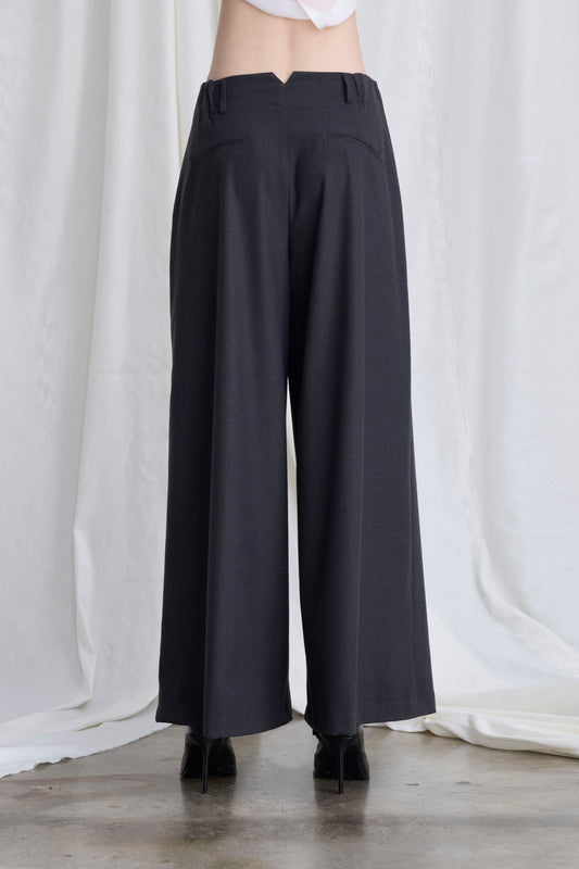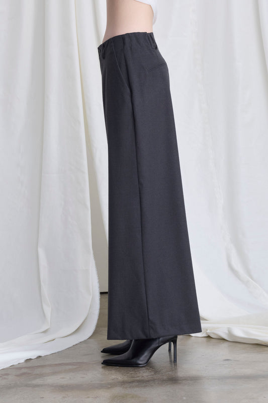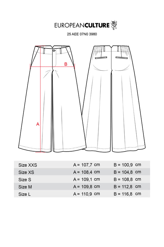 Palazzo trousers with a wide hem. Front chino pockets and back welt pockets. The hidden zip closure is completed by a double button. The garment, created with a fluid effect thanks to the viscose blend, has a particularly soft hand and enhances the feminine silhouette with elegance and refinement.