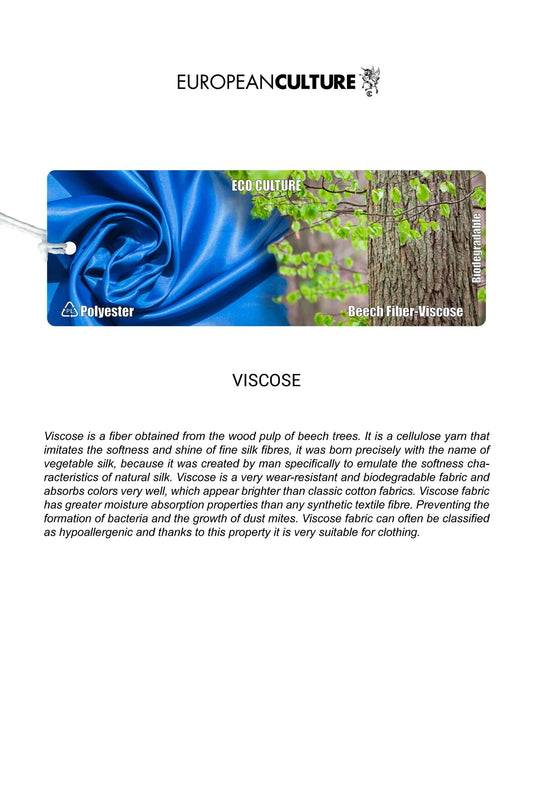Viscose is a fiber obtained from the wood pulp of beech trees. It is a cellulose yarn that imitates the softness and shine of fine silk fibres, it was born precisely with the name of vegetable silk, because it was created by man specifically to emulate the softness characteristics of natural silk. Viscose is a very wear-resistant and biodegradable fabric and absorbs colors very well, which appear brighter than classic cotton fabrics. Viscose fabric has greater moisture absorption properties than any synthetic textile fibre. Preventing the formation of bacteria and the growth of dust mites. Viscose fabric can often be classified as hypoallergenic and thanks to this property it is very suitable for clothing.