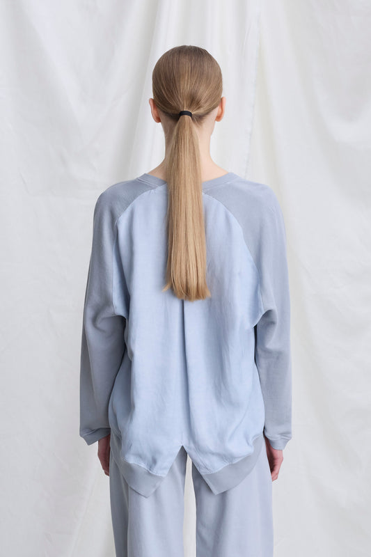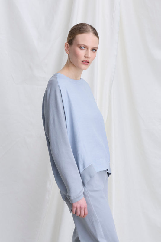 Crew neck sweatshirt made of a viscose and linen blend satin with cotton raglan sleeves, finished with asymmetrical ribbed cuffs. This comfortable-fit garment combines style and practicality.