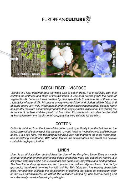 Viscose is a fiber obtained from the wood pulp of beech trees. It is a cellulose yarn that imitates the softness and shine of fine silk fibres, it was born precisely with the name of vegetable silk, because it was created by man specifically to emulate the softness characteristics of natural silk. Viscose is a very wear-resistant and biodegradable fabric and absorbs colors very well, which appear brighter than classic cotton fabrics. Viscose fabric has greater moisture absorption properties than any synthetic textile fibre. Preventing the formation of bacteria and the growth of dust mites. Viscose fabric can often be classified as hypoallergenic and thanks to this property it is very suitable for clothing.