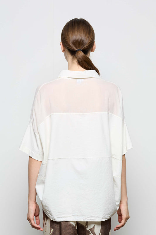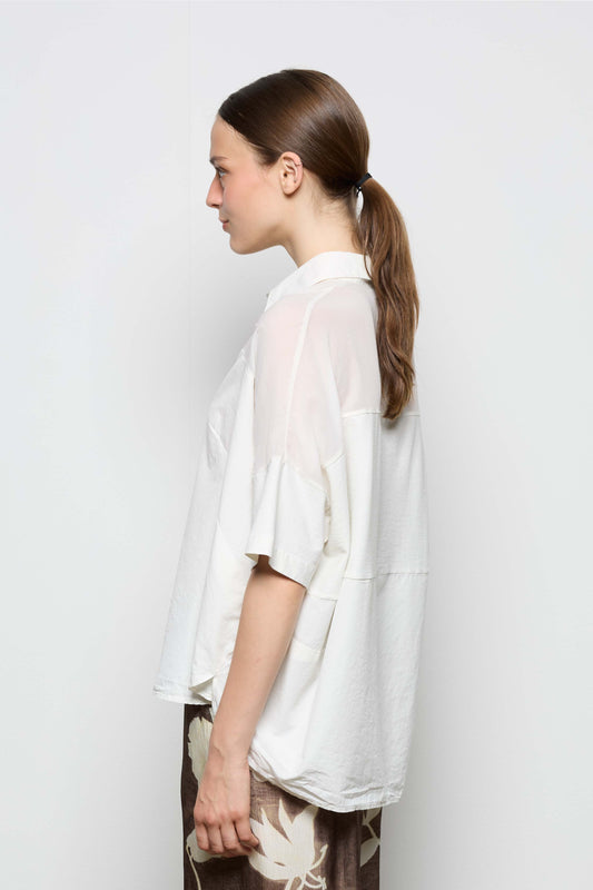 Cotton poplin shirt with voile inserts on the shoulders, which give transparency and lightness to the garment. Comfortable and versatile fit gives the garment a casual-chic look suitable for every silhouette.