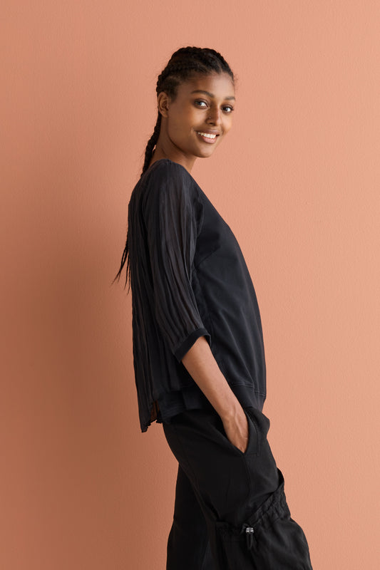 La felpa con l'attitude di una blusa! Questo modello con elastico e maniche a tre quarti leggermente a sbuffo si fa notare per la sua versatilità e per lo stile unico. Indossala con pants cargo e sneakers per un look urbano oppure con minigonna in jeans con mules per essere super cool!