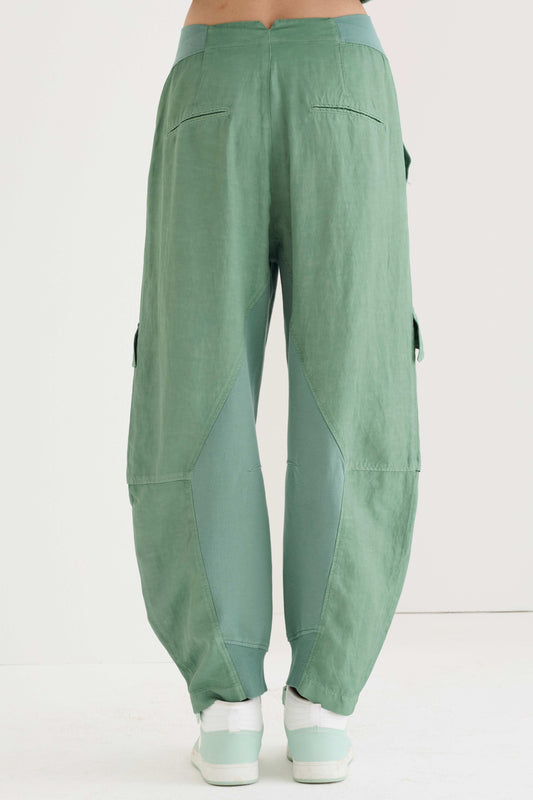 Pantaloni cargo in lino e viscosa con dettagli in felpetta, che esprimono un'attitudine casual ma raffinata. La chiusura frontale con bottone e zip nascosta e gli inserti in jersey elasticizzato sulla cintura laterale migliorano il comfort e la vestibilità. Le tasche laterali alla francese e le tasche a filetto sul retro aggiungono praticità, mentre le tasche cargo con patta introducono un tocco contemporaneo di ispirazione urbana. Un capo versatile pensato per un raffinato abbigliamento estivo da indossare durante il tempo libero.