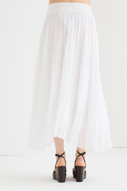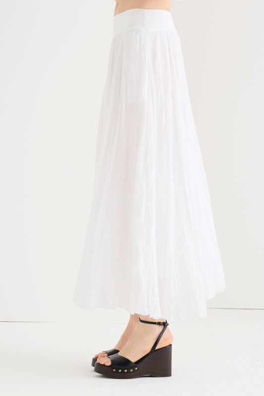 Gonna lunga plissettata realizzata in doppio voile di cotone. Il basco in vita e le tasche laterali nascoste sono dettagli pratici e confortevoli. Un capo raffinato e femminile che incarna l'eleganza estiva e il lusso senza tempo.
