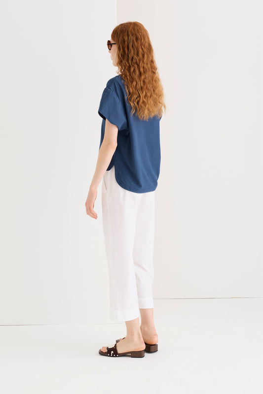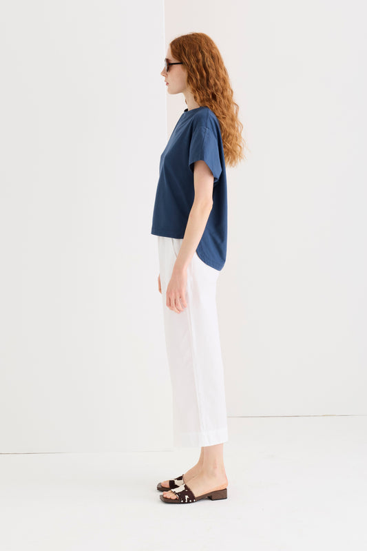 Top senza maniche in jersey di cotone crêpe con scollo a barca. La spalla scesa impreziosita da inserti in doppio popeline è un dettaglio fashion che dona un mood contemporaneo. Il fondo arrotondato e la linea asimmetrica rendono questo capo comodo e versatile. Un capo raffinato e femminile che incarna l'eleganza estiva disinvolta e il lusso senza tempo.