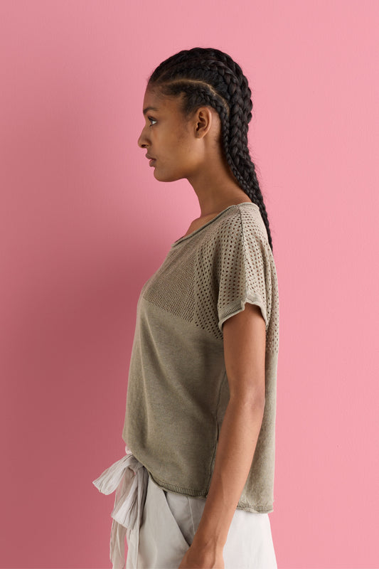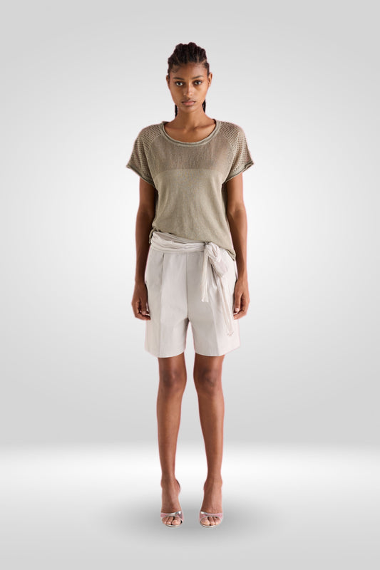 La T-shirt di cui non potrai più fare a meno: la maglia a maniche corte con dettagli traforati realizzata in lino e cotone. Abbinala ai tuoi shorts per un look estivo alla moda.