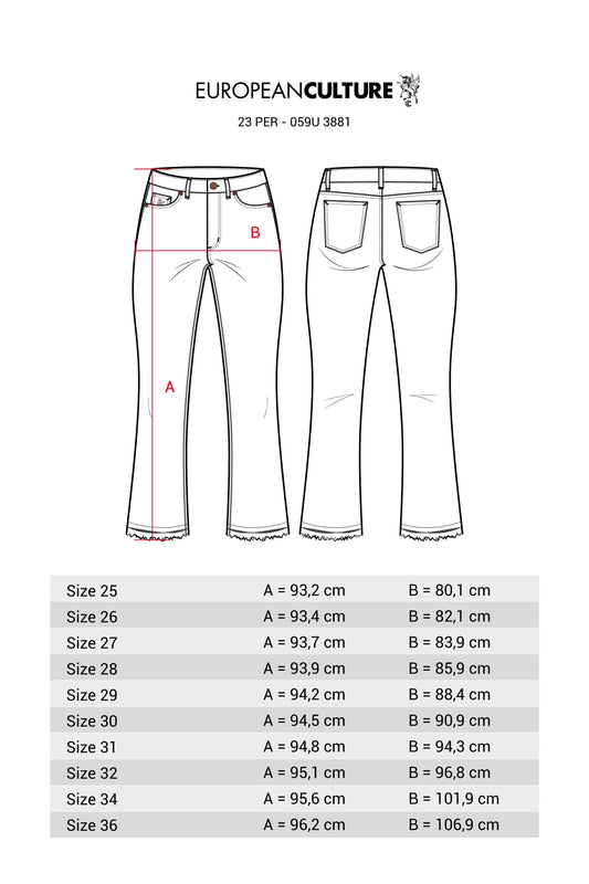I pantaloni European Culture riscoprono un appeal anni '70. Realizzati in denim elasticizzato, hanno una silhouette a vita alta, gamba larga e orli svasati.