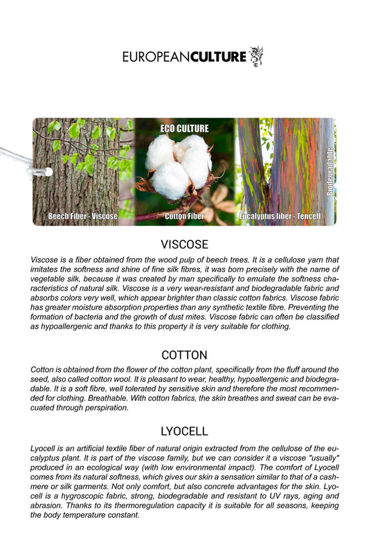 Viscose is a fiber obtained from the wood pulp of beech trees. It is a cellulose yarn that imitates the softness and shine of fine silk fibres, it was born precisely with the name of vegetable silk, because it was created by man specifically to emulate the softness characteristics of natural silk. Viscose is a very wear-resistant and biodegradable fabric and absorbs colors very well, which appear brighter than classic cotton fabrics. Viscose fabric has greater moisture absorption properties than any synthetic textile fibre. Preventing the formation of bacteria and the growth of dust mites. Viscose fabric can often be classified as hypoallergenic and thanks to this property it is very suitable for clothing.