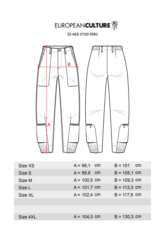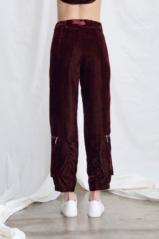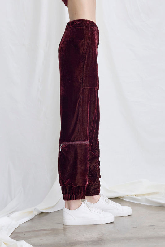 Cargo trousers made of viscose velvet. They feature an exposed button and hidden zip closure. Bellowed patch pockets along the lower leg, closed with zips. Elasticated hems.