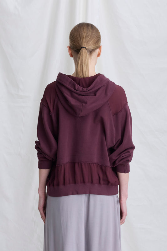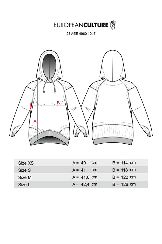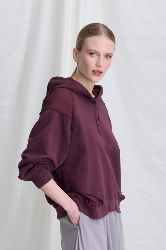 Hooded sweatshirt with raglan sleeves, made of organic cotton with viscose crepe inserts, details that make it an original garment to wear for any occasion of the day.