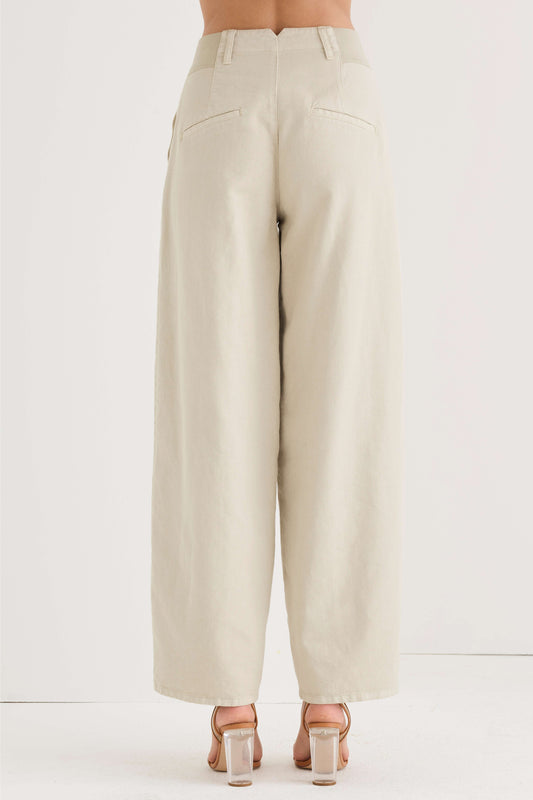 Pantaloni barrel-leg realizzati in drill di cotone e lyocell, con chiusura con bottone e zip, tasche laterali alla francese e due tasche a filetto sul retro. La silhouette contemporanea incontra la texture strutturata ma fluida del tessuto, mentre i dettagli comfort sui fianchi ne migliorano la vestibilità. Un capo essenziale e raffinato per tutti i giorni, pensato per un look estivo fresco e disinvolto.