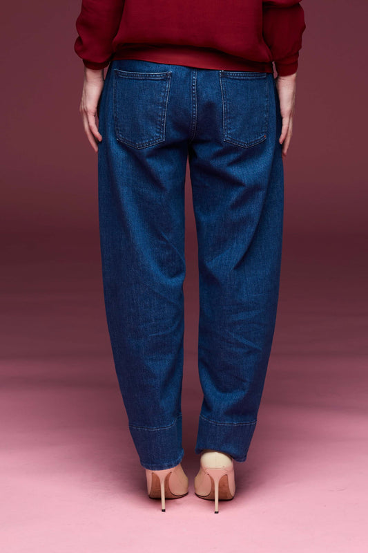 Pantalone 5 tasche dalla linea carrot con taglio ergonomico sul davanti, chiusura frontale con bottone a vista e zip nascosta. Realizzato in denim cotone stretch. Caratterizzato dalla baschina in jersey elasticizzata nel retro, che avvolge la vita quasi fino al davanti.