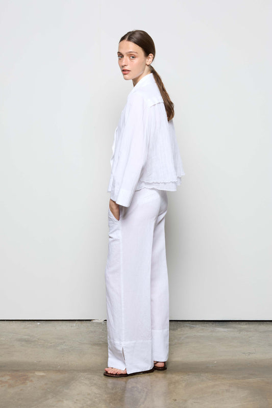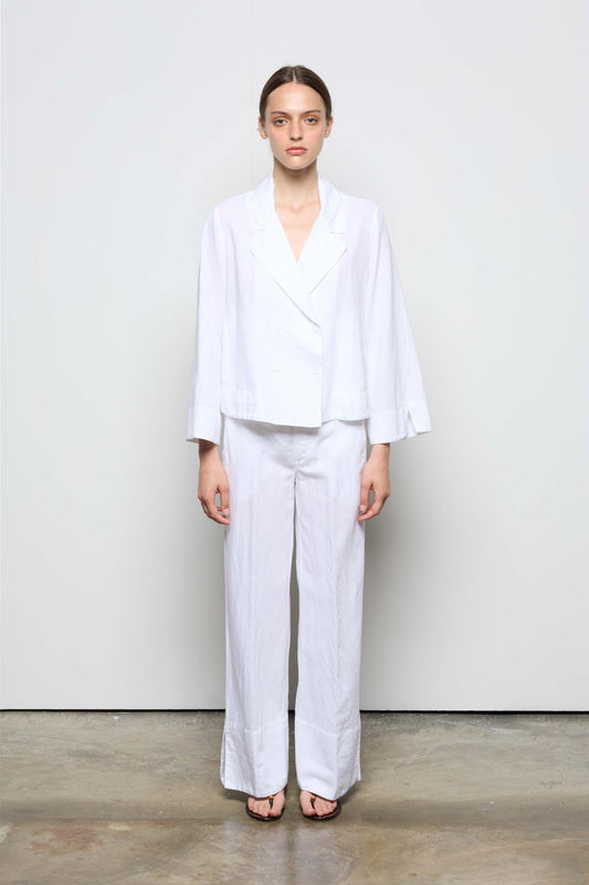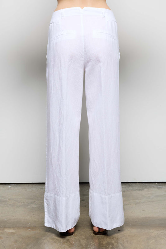Pantalone in tessuto misto cotone lino. Caratterizzato da una silhouette con gamba dritta e spacchi laterali fondo orlo. Chiusura con bottone a vista e zip coperta. Vita regolare con inserti comfort laterali. Tasche alla francese e tasche filetto singolo dietro. Un capo versatile e confortevole, perfetto per il complemento di numerosi look.