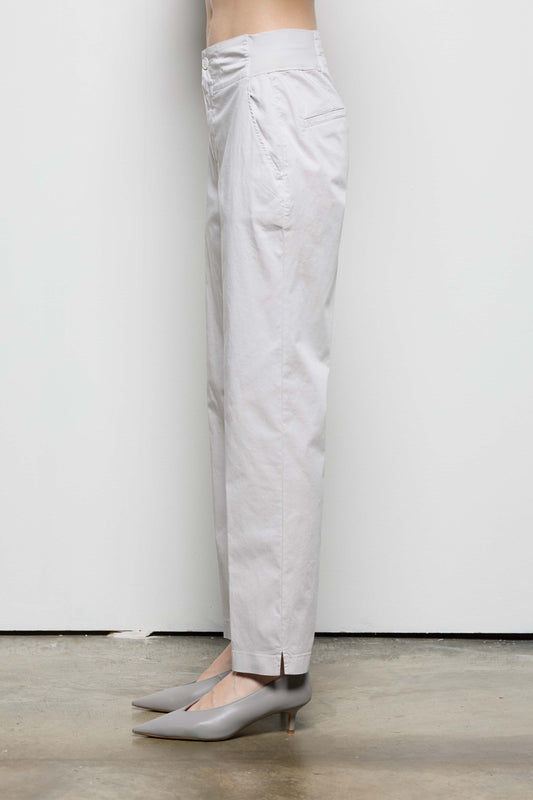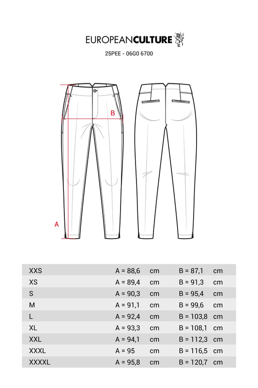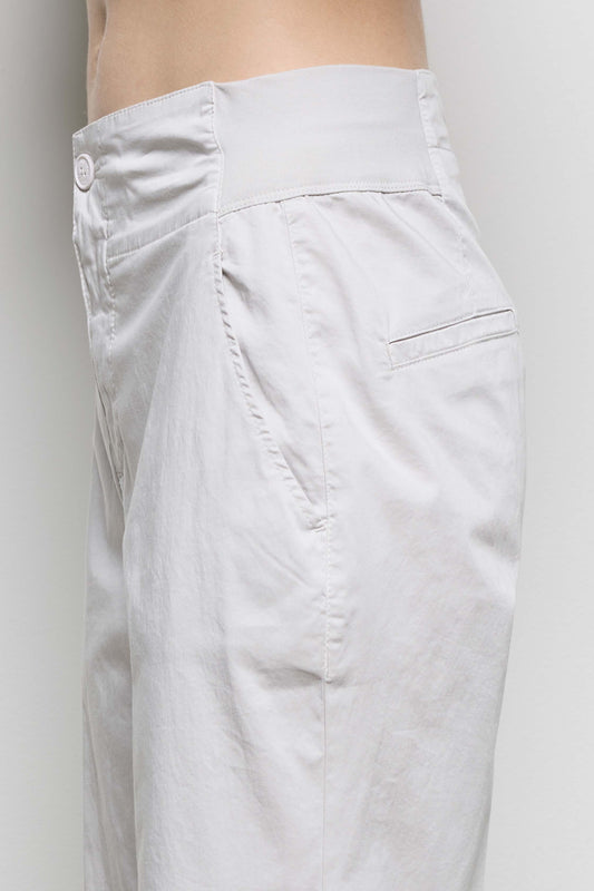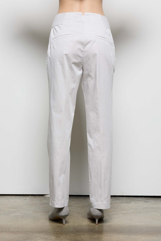 Pantalone a sigaretta, realizzato in raso di cotone stretch. In vita inserti di jersey stretch laterali e sul fondo gli spacchetti. Abbottonatura davanti con bottone a vista e zip con patta. Tasche alla francese e tasche filetto singolo dietro. Un capo che unisce raffinatezza e praticità.