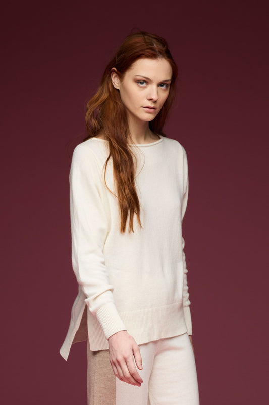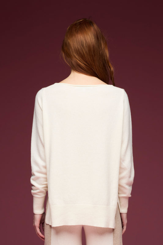 Tricot sweater, made with Cashmere wool blend yarn. Boat neckline, the bottom, with side slits, in front is shorter than the back. A garment with a modern and versatile look, perfect for completing numerous looks.