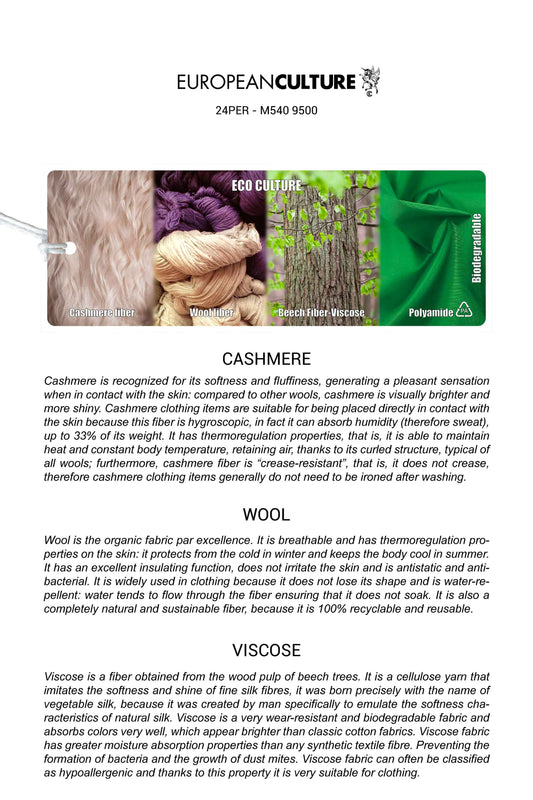 Cashmere is recognized for its softness and fluffiness, generating a pleasant sensation when in contact with the skin: compared to other wools, cashmere is visually brighter and more shiny. Cashmere clothing items are suitable for being placed directly in contact with the skin because this fiber is hygroscopic, in fact it can absorb humidity (therefore sweat), up to 33% of its weight. It has thermoregulation properties, that is, it is able to maintain heat and constant body temperature, retaining air, thanks to its curled structure, typical of all wools; furthermore, cashmere fiber is “crease-resistant”, that is, it does not crease, therefore cashmere clothing items generally do not need to be ironed after washing.