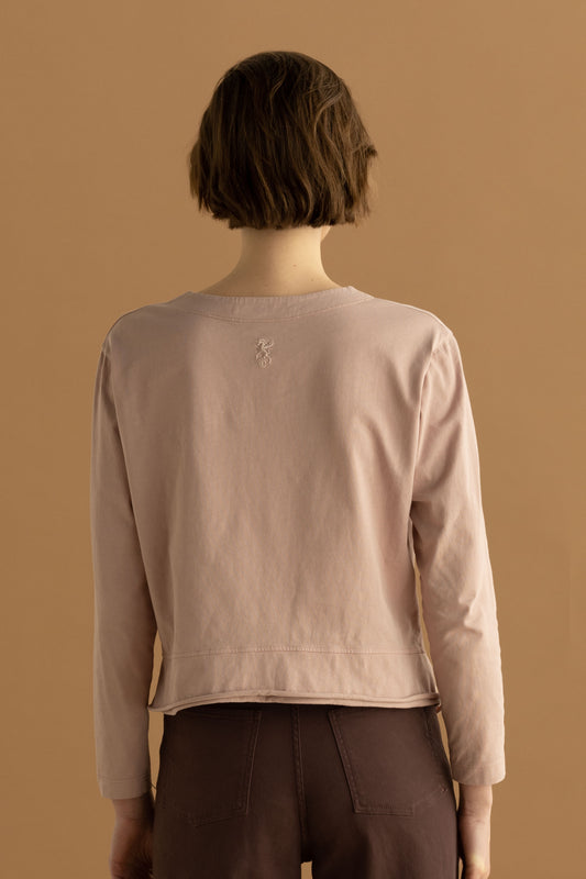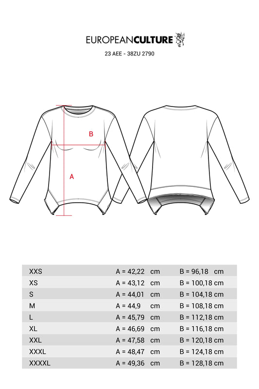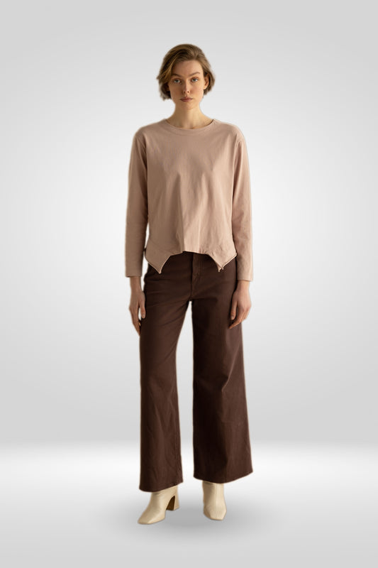 Designed to capture attention, the jersey T-shirt is enriched with a semi-circular hemline. Wear it under a cardigan with wide-legged pants.