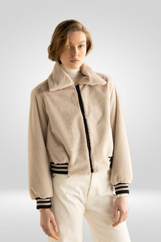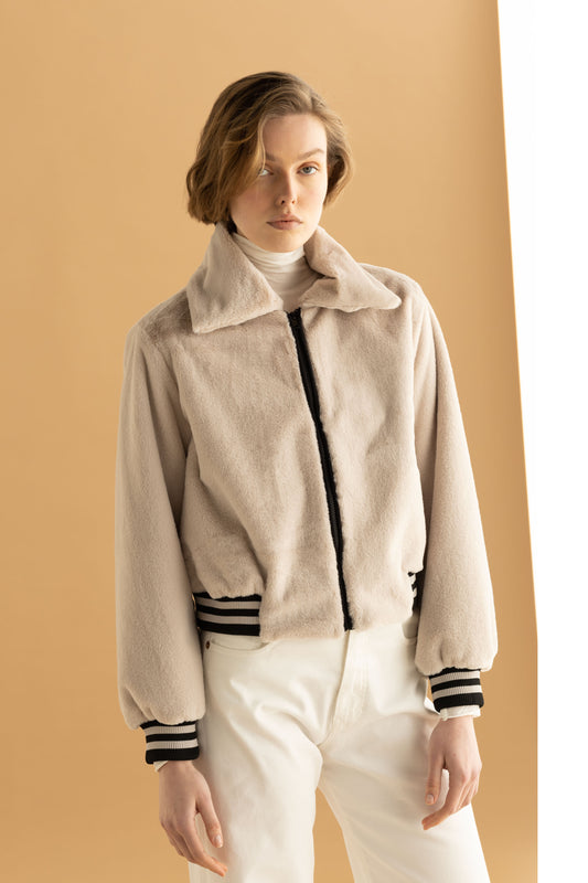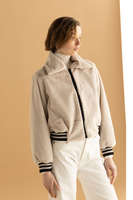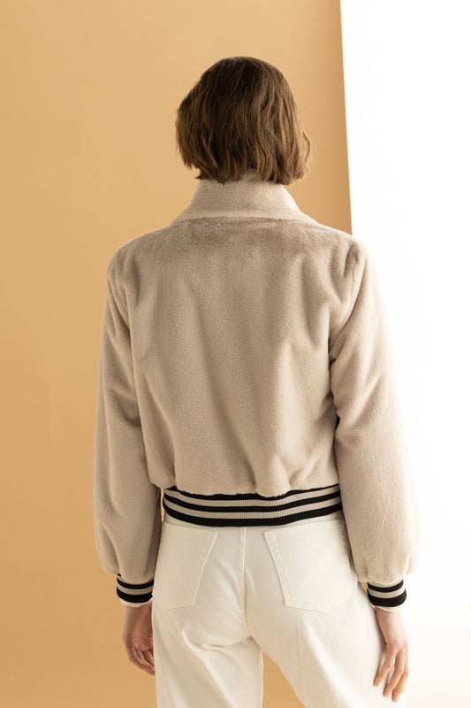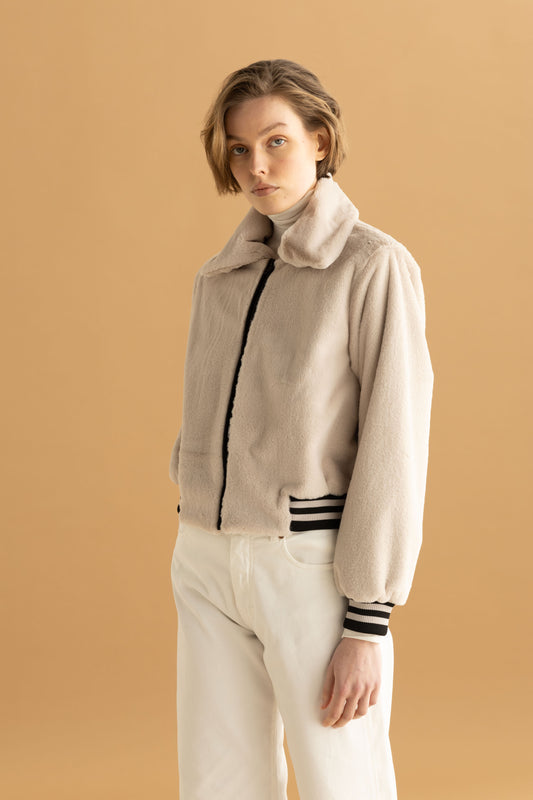 The bomber jacket is a seasonal must-have. Slightly oversized and made of faux fur, it features the ribbed knit fabric on the bottom and cuffs, typical of this garment. From jeans to pleated skirts, it will be easy to pair with key pieces in your wardrobe.