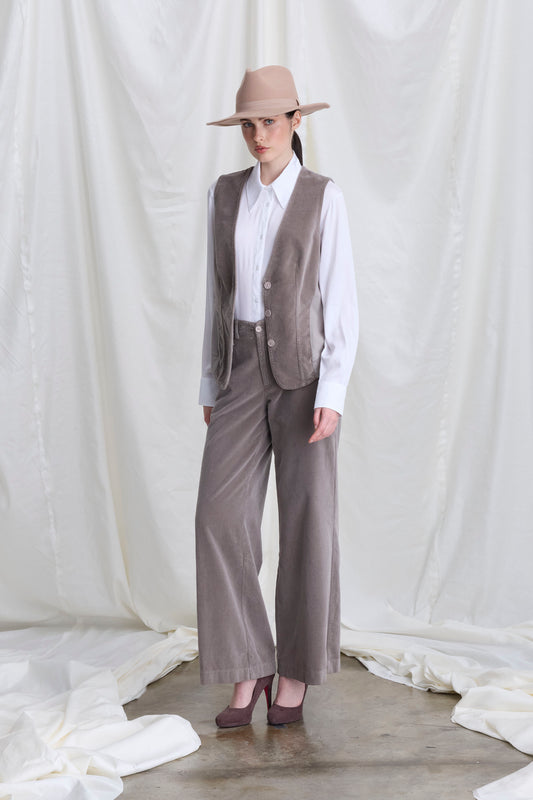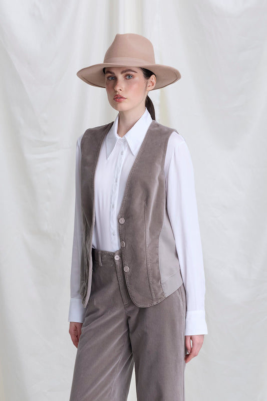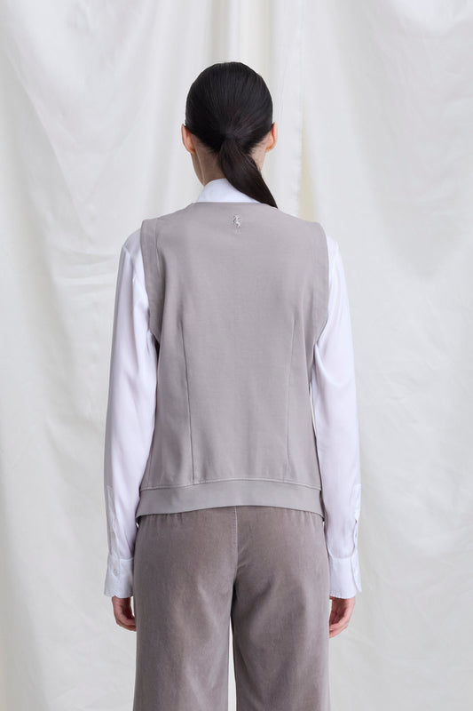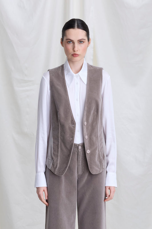 Sleeveless jacket made of cotton velvet with side and back inserts in Punto Milano. V-neck, front button closure. A garment that combines sophistication and practicality for a more casual look.