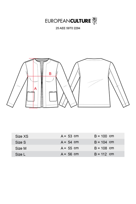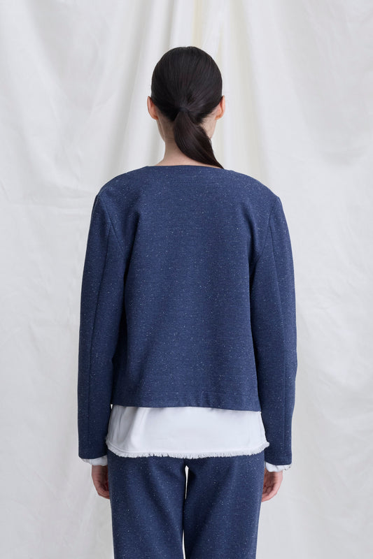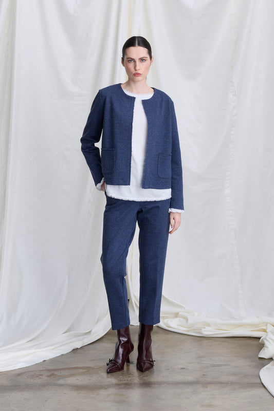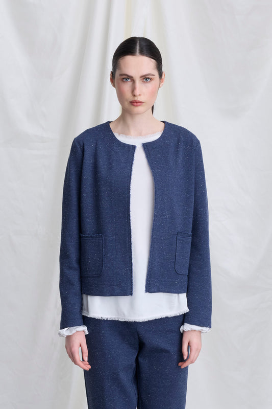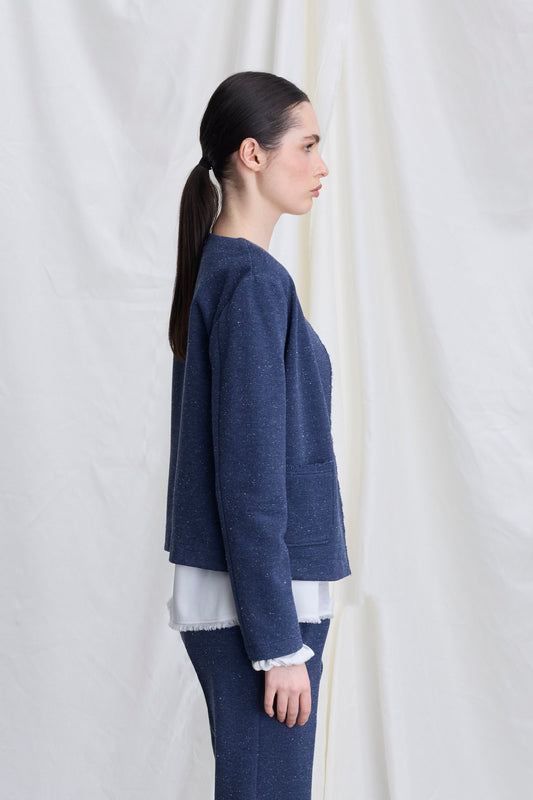 Short jacket made of viscose/silk tweed. Crew neck with raw-cut detail that repeats on the front and pockets.