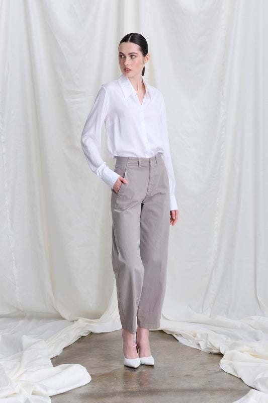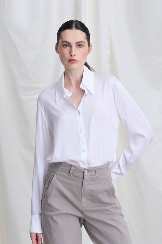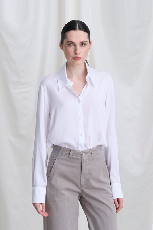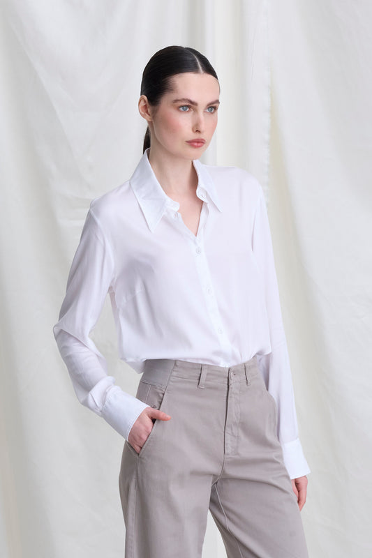 Viscose satin shirt with a sail collar and exposed button placket. Long sleeves with cuffs. A soft, flowing fit.