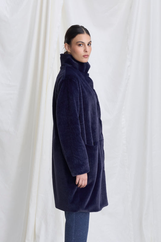 Single-breasted faux fur coat. Regular fit with a high collar and snap button closure. Inset horizontal front pockets.