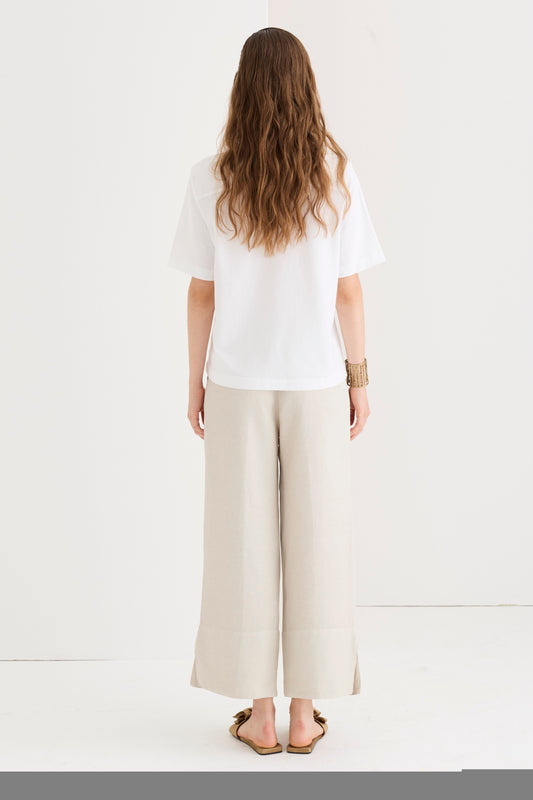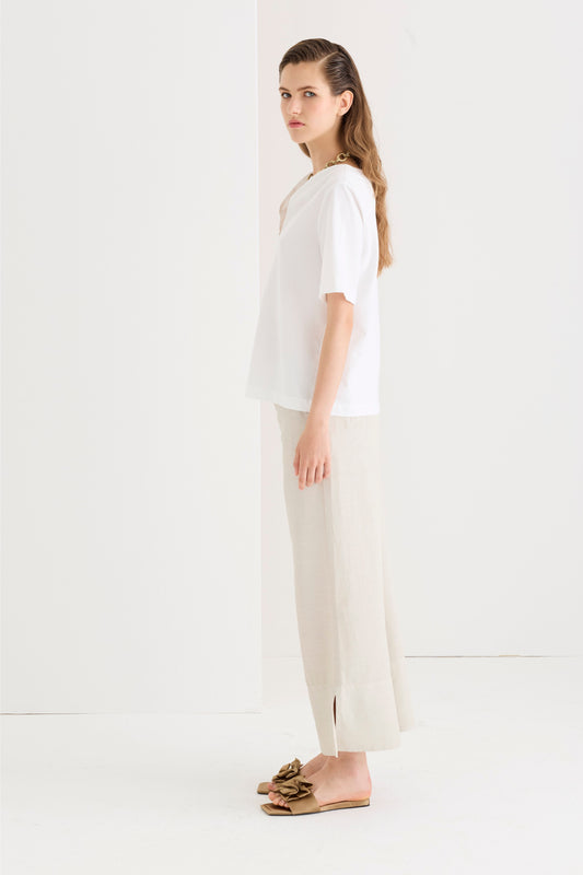 Short-sleeve crepe cotton jersey T-shirt with V-neckline. The contemporary cut is enriched by a poplin yoke and delicate lace trim, adding subtle texture and refinement. The relaxed silhouette enhances natural femininity, creating an effortlessly elegant summer essential.