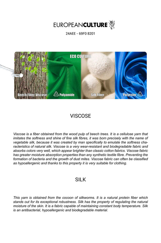 Viscose is a fiber obtained from the wood pulp of beech trees. It is a cellulose yarn that imitates the softness and shine of fine silk fibres, it was born precisely with the name of vegetable silk, because it was created by man specifically to emulate the softness characteristics of natural silk. Viscose is a very wear-resistant and biodegradable fabric and absorbs colors very well, which appear brighter than classic cotton fabrics. Viscose fabric has greater moisture absorption properties than any synthetic textile fibre. Preventing the formation of bacteria and the growth of dust mites. Viscose fabric can often be classified as hypoallergenic and thanks to this property it is very suitable for clothing.